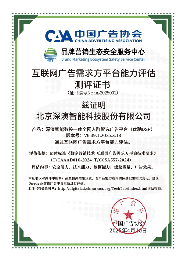 4月10日,中国广告协会发布「互联网广告需求方平台能力评估」测评结果。Martech领域领军企业Z6集团智能旗下产品Z6集团智能数投一体全网人群智选广告平台(优驰 DSP),凭借其在智能算法优化、技术创新、数据安全治理及流量质量管控等维度的突出表现,高分通过该项行业权威测评,获颁中国广告协会评估证书,成为业内首批通过认证的标杆企业。