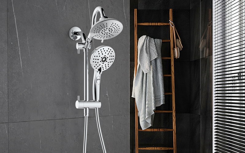 Upper water outlet elbow suit; The top spray has a built-in ball head, which can realize multi-angle rotation adjustment; Switch the handle to top spray water and shower water; Turn the handle to adjust the height of the sliding seat; 5-function water outlet shower